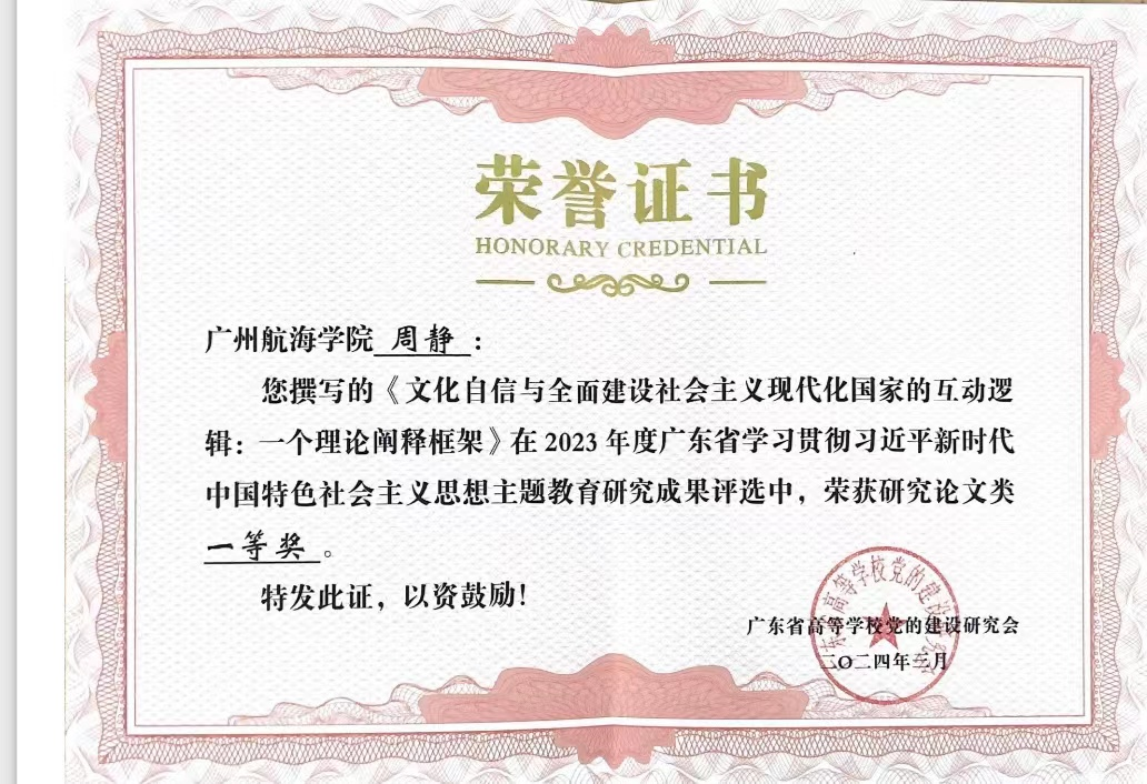 会上还对广东省高校党建研究会2023年度主题教育研究成果进行了现场颁奖。学校m88在线网站入口周静博士撰写的《文化自信与全面建设社会主义现代化国家的互动逻辑:一个理论阐释框架》喜获研究论文类一等奖。