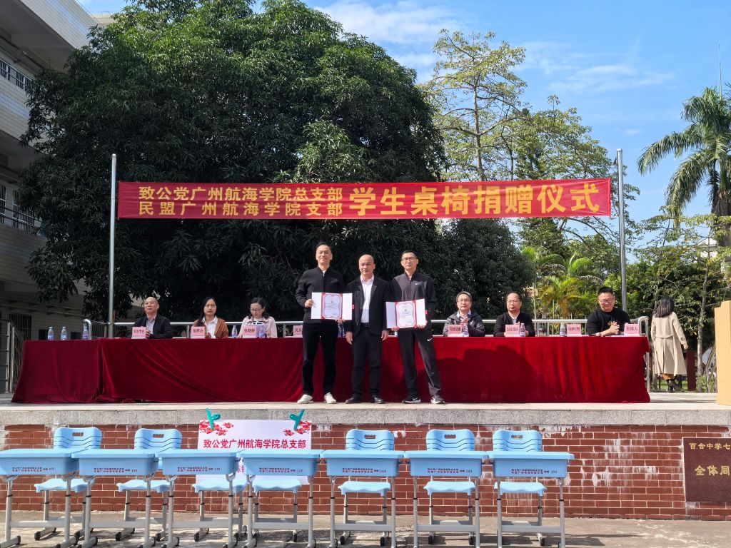 11月27日上午,开平百合中学举行了简朴而庄重的学生课桌椅捐赠仪式。民盟支部主委贺泽江、致公党总支部副主委吴永明代表各自组织向百合中学“周文雍陈铁军班”班级捐赠学生桌椅150套,并将剩余款项交至学校用于“周文雍陈铁军班”班级建设。百合中学校长关能立向两个民主党派组织颁发了捐赠证书并致以诚挚的感谢。