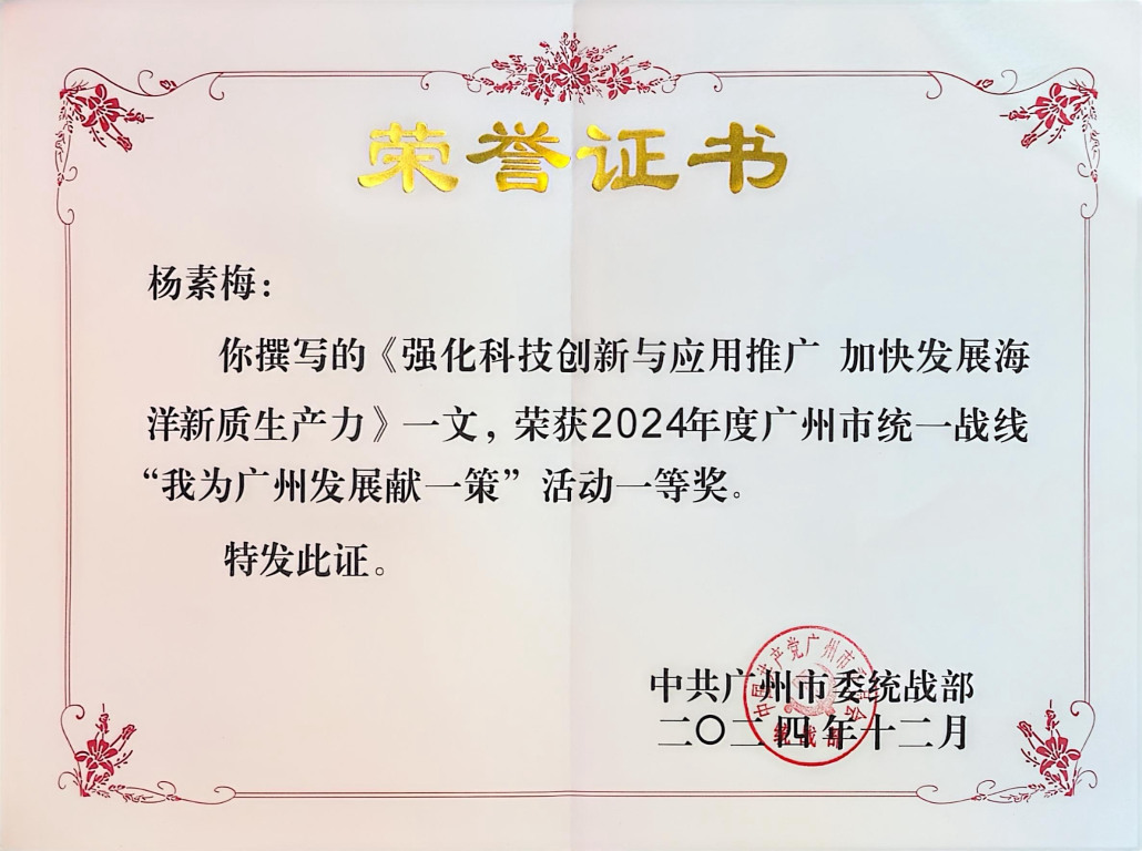 12月27日,2024年度“我为广州发展献一策”活动成果汇报会在广州市社会主义学院召开。我校致公党总支部主委、海事法律与交通管理学院杨素梅老师撰写的《强化科技创新与应用推广 加快发展海洋新质生产力》一文荣获2024年度广州市统一战线“我为广州发展献一策”活动“一等奖”。