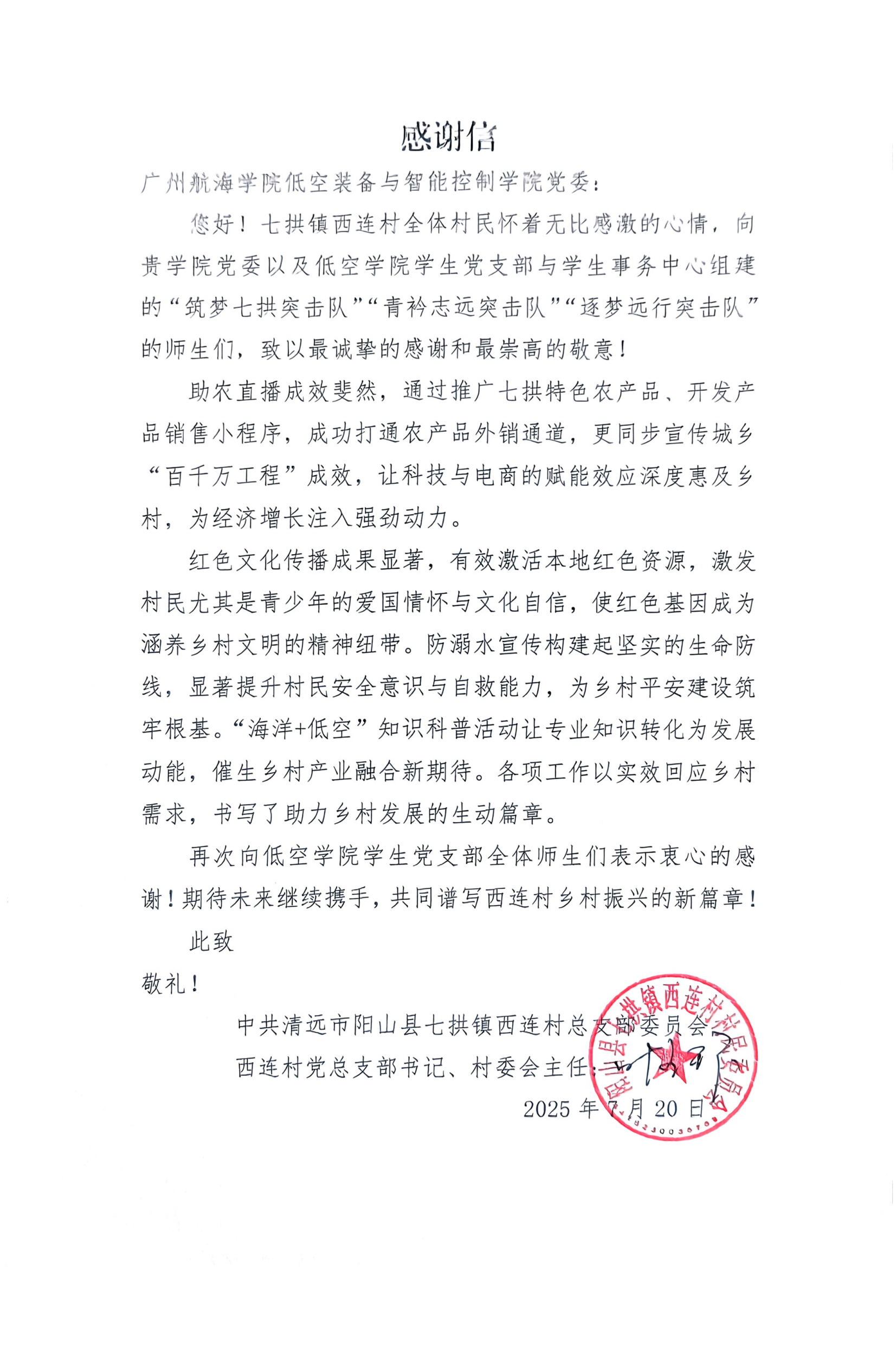 近日,低空学院党委收到清远市阳山县七拱镇西连村的感谢信。信中对低空装备与智能控制学院学生党支部等突击队师生表达了真挚谢意。信中表示,实践队员们把专业所长与乡村所需深度对接,从课堂到田野,从直播间到调研路,不仅协助村里搭建起专业直播平台,拓展农产品销售渠道,还积极组织消费帮扶活动,发动各方力量购买村里农产品,同时开展支教捐书活动,以文化浸润丰富村民精神文化生活,既破解了乡村振兴中的“急难愁盼”,更培育了乡村自我发展的“造血功能”。