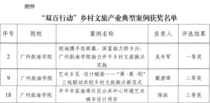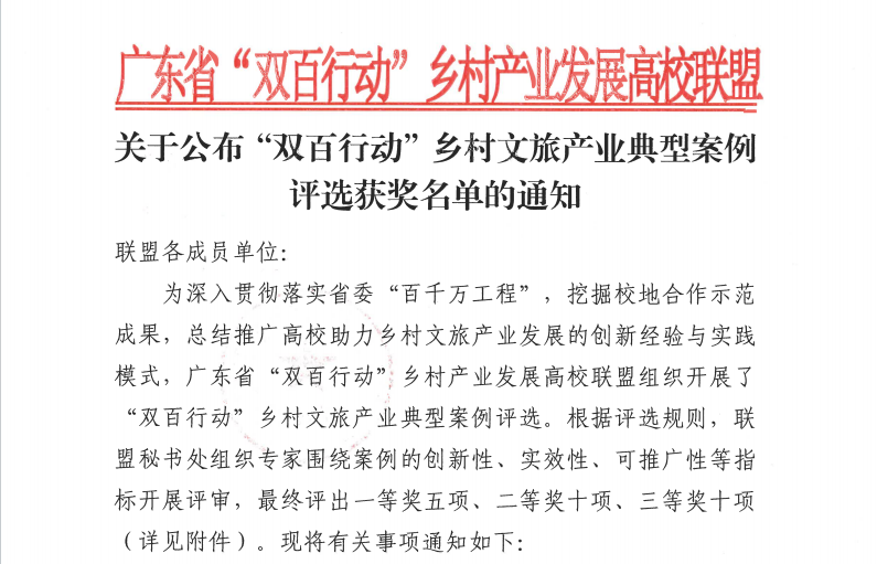 近日,广东省“双百行动”乡村产业发展高校联盟正式发布《关于公布“双百行动”乡村文旅产业典型案例评选获奖名单的通知》。m88在线网站入口师生团队精心打造的3项乡村文旅振兴实践成果分别获得一、二、三等奖,成为本次评选活动中获奖数量最多的高校,充分彰显了学校在服务乡村振兴国家战略中的积极作为与显著成效。